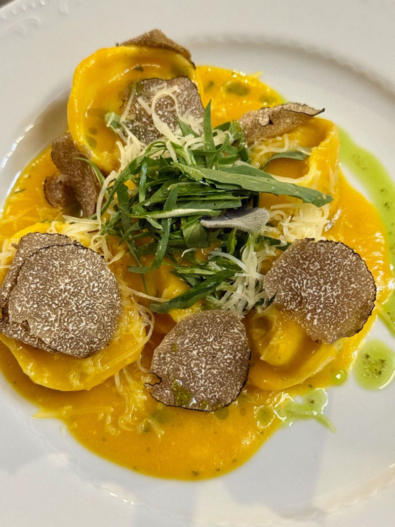 In warm weather, the restaurant moves outdoors to its most iconic display: lunches and dinners are organized in the greenhouse, in the festively lit courtyard, or among the rows of the vineyard.