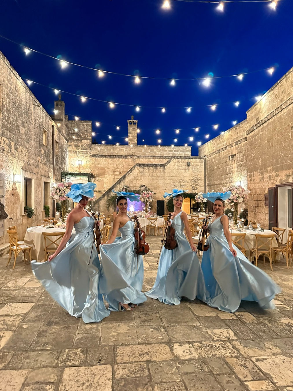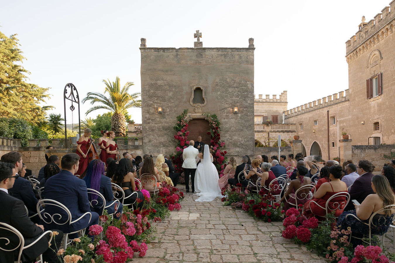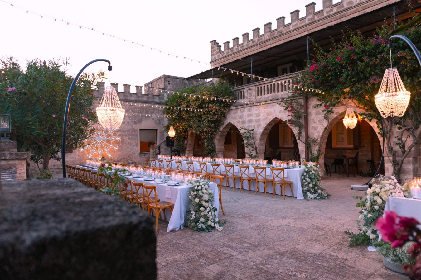 Next, the inner courtyard becomes the perfect setting for the reception: round or rectangular tables, warm lights and Mediterranean scents accompany a personalized menu inspired by Southern Italian tradition.