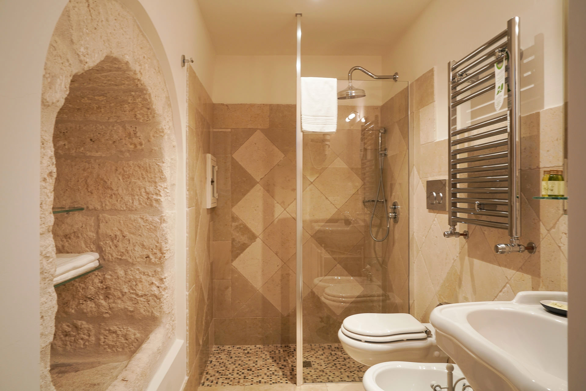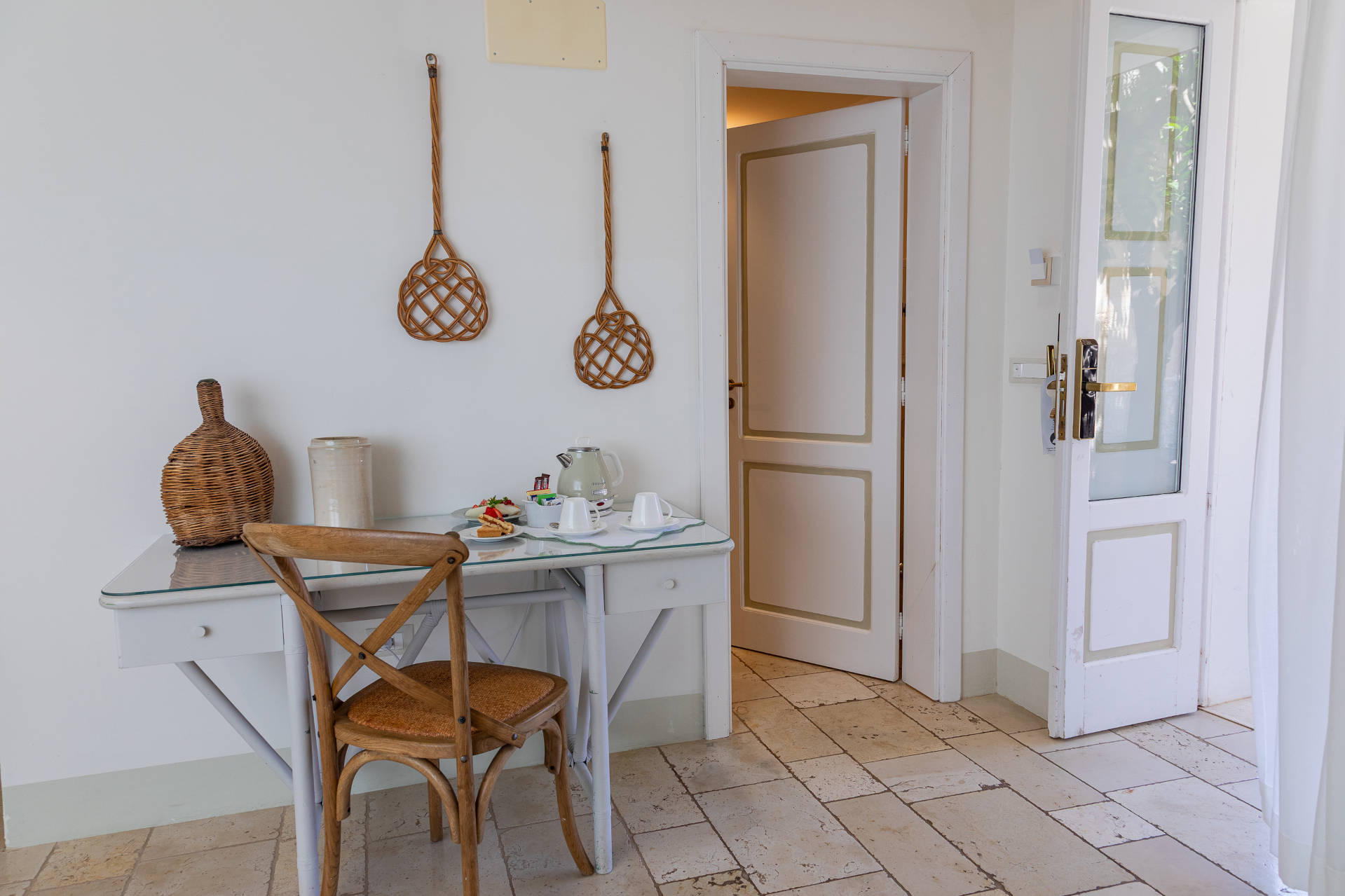 Aria condizionata, TV a schermo piatto, minibar, Wi-Fi gratuito e bagno privato con prodotti di cortesia. Gli arredi e i materiali riflettono lo stile sobrio ed elegante della Masseria.