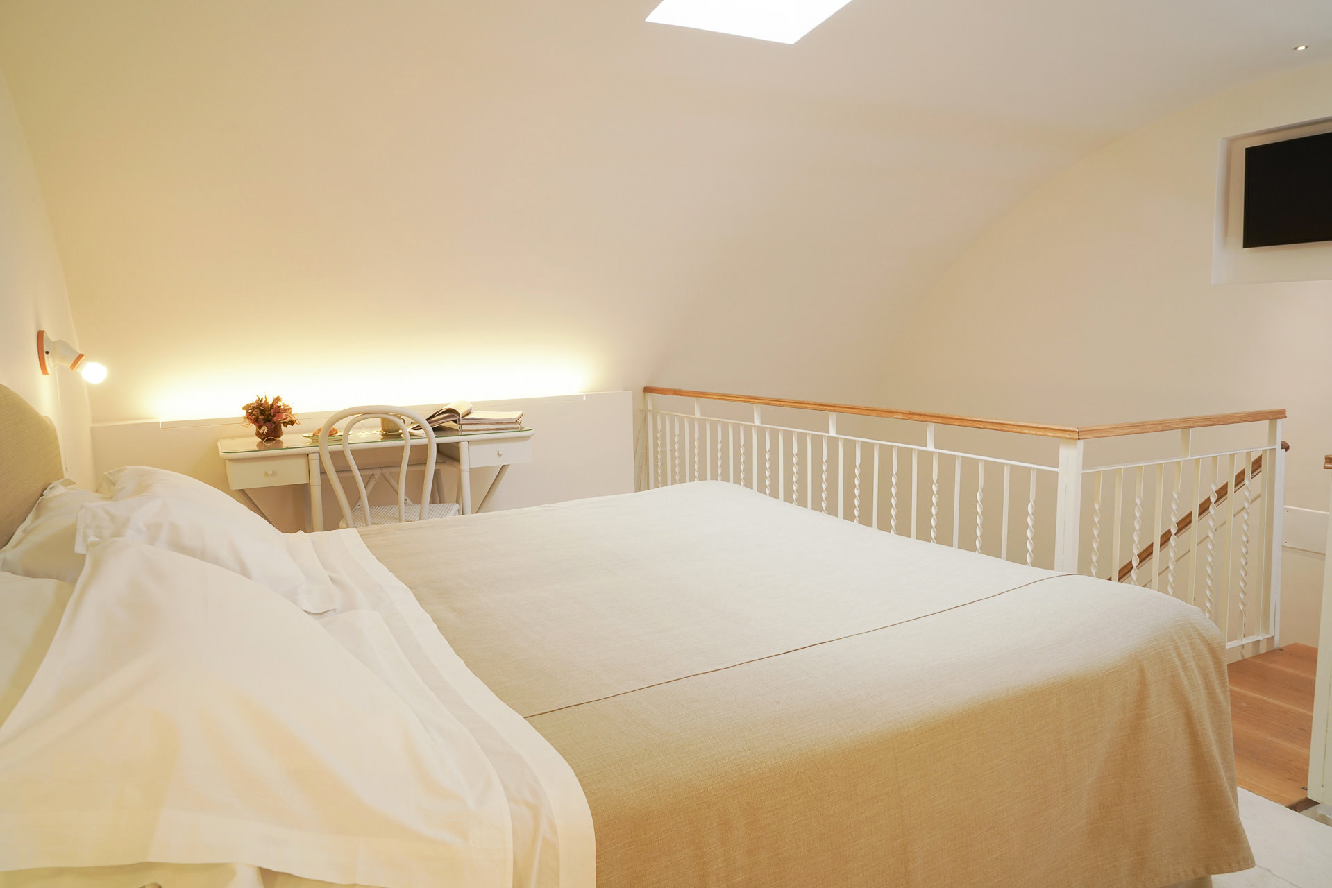 La stanza si sviluppa su due livelli: al piano inferiore una zona giorno con bagno, al piano superiore la camera da letto matrimoniale. Un piccolo loft dal fascino autentico.